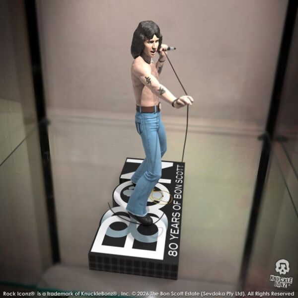 Hand-crafted and only 3000 pieces created. This Bon Scott collectible celebrates Bon Scott's upcoming 80th birthday celebration. All Rock Iconz statues are officially licensed, limited edition collectibles. This is a fine-arts process where each statue is hand-cast, painted and numbered. These statues are created in 1/9 scale. Each statue comes with a certificate of authenticity on the base of the statue.