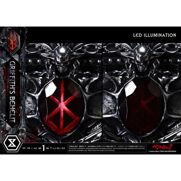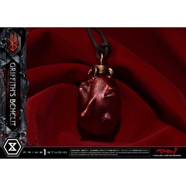 An emblem of the Law of Causality that hung upon the Hawk's chest. Encased in a skull-shaped box, realized in life scale. The Law of Causality-a force that governs those who walk the mortal world and even those who dwell in the astral. Griffith's Behelit, a symbol of this core theme of ""Berserk"", now joins the Life-Scale Masterline series. The enigmatic object that guided the Hawk's dream has been realized as a life-sized collector's item. Subtle distortions and irregular textures lie beneath its deep crimson surface. It includes a pendant cord with a finish evocative of its appearance in the original manga. Every element shown on the page has been carefully incorporated, resulting in a presence that seems to faintly harbor life itself. The skull-shaped box that houses this piece is an original Prime 1 Studio design, inspired by motifs closely associated with the Skull Knight-skulls, swords, and curling rose vines. Velvet-like fabric lines the interior, while an LED-lit Brand of Sacrifice offers a glimpse into the abyss. A life-scale tribute to Griffith's Behelit. Crafted with precision to satisfy the deepest cravings of your collection. * This product is intended for viewing/appreciation and display purposes. Any promotional images showing it worn around the neck are for presentation only. Please refrain from using it as an accessory. - Special Box with LED Illumination - Griffith's Behelit LED Power Supply Method: TBD * Please prepare batteries, USB cables, or other necessary items depending on the final power supply method." Product Size:6 x 4 x 5 cm Special Box: 14 x 20 x 18 cm