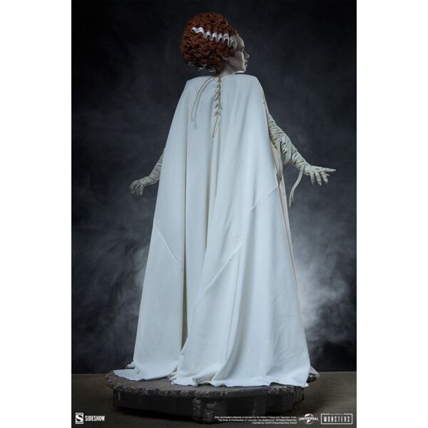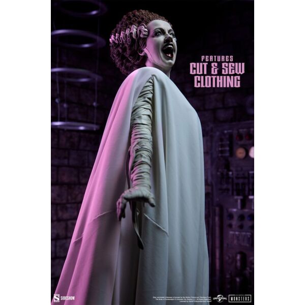 "An audience needs something stronger than a pretty little love story. So, why shouldn't I write of monsters?" - Mary Shelley (The Bride of Frankenstein, 1935) Sideshow presents The Bride of Frankenstein Premium Format Mixed Media™ Figure, an officially licensed Universal Monsters collectible. This detailed statue features real fabric costuming paired with sculptural elements for an electrifying, full-color tribute to Elsa Lanchester's performance as the iconic monster's mate in The Bride of Frankenstein (1935). Though her screen time lasted mere minutes, The Bride of Frankenstein has become immortalized in horror cinema for her striking appearance and piercing shriek. Sideshow is proud to offer collectors a stunning new quarter-scale rendition of the Bride, draped in a flowing white fabric gown with lacing down the spine. Beneath her outer dressings, The Bride of Frankenstein Premium Format Mixed Media™ Figure features a fully detailed polystone sculpt of her bandage-wrapped body. Newly awakened, she stands on the ramshackle wood flooring of Henry Frankenstein's laboratory. To better encompass Elsa Lanchester's unforgettable silver screen presence, The Bride of Frankenstein Premium Format Mixed Media™ Figure includes two detailed portraits that bring cinema history to life in true behind-the-scenes fashion. Based on the actual colors of the wig worn in the production, the Bride has red hair with white streaks on either temple, accented with pearlescent paint to emphasize the shock value of that memorable style. Capture her wide-eyed confusion and curiosity with her neutral expression or unleash a horrified hiss and display her screaming expression. Each portrait is finished with a pallid complexion and her stunning yet subtle makeup application. Pair this high-end Universal Monsters statue with other releases sold separately in the Sideshow collection, including the Frankenstein Premium Format Mixed Media™ Figure, based on 1931's Frankenstein film, for the ultimate tribute to horror in your home. Woman ... friend ... wife ... Give your collection a new companion and bring home The Bride of Frankenstein Premium Format Mixed Media™ Figure today. Producte Size: 55 x 28 x 31 cm
