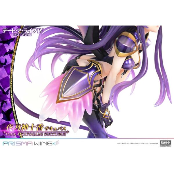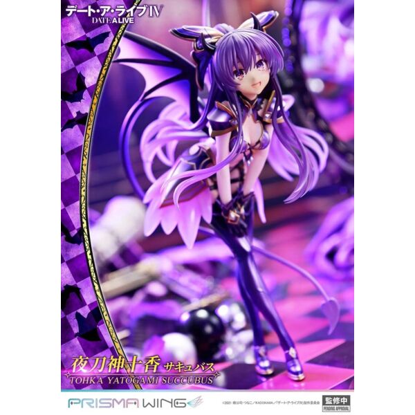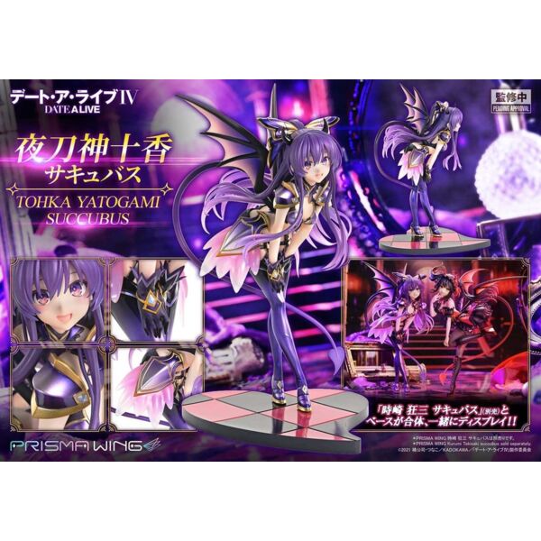 "Temptation in an Innocent Smile! The ""Princess"" in a Succubus-Style Figure From the ""DATE A LIVE"" anime series comes ""Tohka Yatogami"" in a succubus-style appearance. Her little-devil costume-inspired by her Astral Dress-is an original PRISMA WING design. Discover a slightly different side of the ""Princess,"" and let that innocent smile lure you in! Feature 01: Pure expression and translucent skin. Light, flowing long hair Her bright, open smile and clear, flawless complexion are quintessential Tohka. The long hair is meticulously sculpted, and the airy motion at the tips is realized with clear parts. Feature 02: A delicate pose that highlights her graceful S-curve. Rich, tactile paintwork throughout Her upward-glancing pose emphasizes both her sweetness and an elegant S-curve. From the lustrous sheen on the armor-style accents to the softly blended gradients on the wings, every area features paintwork with a refined sense of texture. Feature 03: A large heart manifests from the ""Princess"" and the ""Nightmare"" The base can be combined with the separately sold ""PRISMA WING DATE A LIVE Kurumi Tokisaki Succubus."" Together, their purple and red tails form a large heart, bringing the two Spirits' feelings to life on your display." Product Specifications: - Sepcial Base