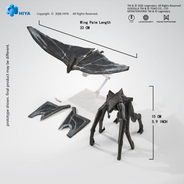 New from the Hiya Toys EXQUISITE BASIC Series Godzilla (2014) Male & Female Muto Set arrives. The all-new EXQUISITE BASIC Series Godzilla (2014) Male & Female MUTO Set is based on original film CG, bringing on-screen ancient Titans into collectible form. The Female MUTO stands approximately 16 cm tall, the Male MUTO 11 cm, with a wingspan of about 33 cm. Both figures finished in deep gray to charcoal black tones, with newly added fluorescent paint applied to the eyes. While the Female MUTO's abdomen also features fluorescent detailing that reacts under UV light, highlighting its unique biological structure as seen in the film. For articulation, Male MUTO's wings incorporate a built-in wires PVC structure, allowing natural bending and angle adjustment. The Female MUTO features articulated legs with wide outward and forward-backward movement. Jaw is articulated for wide opening with moveable tongue for adding display options. Multiple articulation points throughout both figures enable a wide range of battle-ready poses. For accessories, the Male MUTO includes 2x interchangeable wing parts and a display stand for aerial poses. The set also comes with 1x missile, allowing you to recreate a key scene from the film and enhance overall display presence.