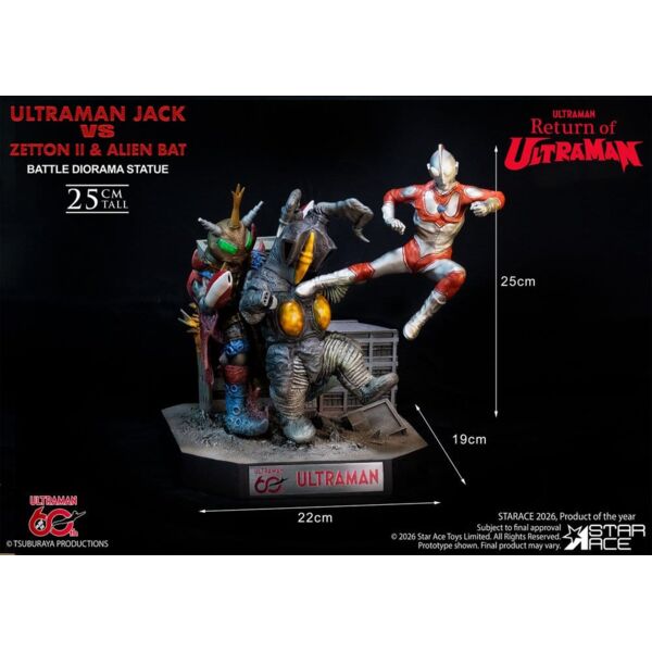 Step into the thrilling universe of Ultraman with the spectacular 60th Anniversary commemorative statue from Star Ace! This masterfully crafted polyresin statue brings to life an iconic clash from Return of Ultraman, featuring Ultraman Jack in an electrifying battle against the mighty Zetton II and the menacing Alien Bat. Every detail has been meticulously sculpted and hand-painted to capture the intensity and heroism of this legendary moment. Standing 25 cm tall, the piece showcases dynamic posing, dramatic energy effects, and breathtaking realism-making it a true centerpiece for display. Made from premium polyresin with a weighty, high-end feel, this statue is both a tribute to six decades of Ultraman and a must-have collectible for fans and seasoned collectors. Celebrate the legacy, honor the heroes, and own a piece of Ultra-history today!