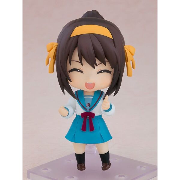 From "The Melancholy of Haruhi Suzumiya" comes a new Nendoroid of Haruhi Suzumiya! Face plates: - Determined face - Displeased face - Smiling face Optional parts: - Ponytail head part - Megaphone - Armband (brigade chief/super director/super 3000) - Other optional parts for different poses.