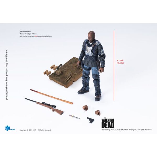HIYA Toys EXQUISITE MINI Series welcomes a new item - Morgan from The Walking Dead joins the 1/18 scale action figure lineup. Since its premiere in 2010, The Walking Dead has captivated audiences worldwide with its gripping portrayal of post-apocalyptic survival and the exploration of human nature. With his calm presence and unique perspective, he stands out as a striking figure in the desolate world of The Walking Dead. This brand-new EXQUISITE MINI Series Morgan action figure stands at 10.5CM tall and is faithfully recreated based on his onscreen appearance. The head sculpt captures Morgan's resolute and composed expression, while the layered outfit, armor details, and fabric textures are meticulously crafted for realism. For weapons and accessories, Morgan's signature staff, a rifle, a pistol and a finely detailed dagger with 2X interchangeable hands to enhance playability. With multiple articulated joints highly posable body design allows you to recreate various action poses. Additionally includes a randomly selected exclusive stand from four different appearances, replicating scenes of scattered bodies remains and muddy grounds, perfectly evoking the chaos and danger of the most thrilling bloodbath!