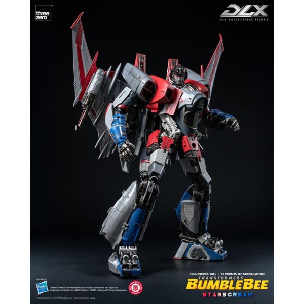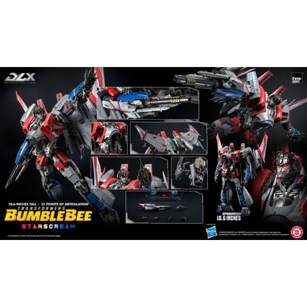 From the live-action film Transformers: Bumblebee, Threezero proudly presents the DLX Starscream! This figure features threezero's renowned painting techniques to meticulously recreate Starscream's appearance from the film. DLX Starscream stands approximately 27 cm (10.6 inches) tall. DLX Starscream features newly sculpted parts including head, signature shoulder intakes, and other details and elements across his body, arms, and legs. He also features a magnetically controlled eye lighting system, and a die-cast alloy internal frame for enhanced durability and handling, with approximately 51 points of articulation. The knee joint structure has also been reconfigured using die-cast alloy. This allows the figure to offer excellent balance and dynamic posing, providing a premium feel. The body showcases precise, sculpted details and mechanical structures, combined with threezero's signature battle-damaged weathering techniques, which carefully reproduces mechanical abrasions for realistic textures. DLX Starscream additionally comes with various interchangeable hands and weapons, including a Null-ray Blaster and an Electron Spike Blade, allowing for a wide range of dynamic action poses. FEATURES - Officially Licensed by Hasbro and TakaraTomy - Features a die-cast alloy internal frame to enhance durability and handling - Features a magnetically controlled eye lighting system - Approximately 10.6 inches Tall (27cm) - 51 Points of Articulation - Die-cast metal parts - LED Illuminated eyes* - The newly sculpted parts include: Head, Chest Details, Shoulder Intakes, Leg and Arm elements, et al - Reconfigured knee joint with die-cast alloy for improved durability ACCESSORIES - 2 interchangeable right forearms: one (1) standard right forearm, and one (1) right forearm with Null-ray Blaster - 1 Interchangeable left hand with Electron Spike Blade - 3 Pairs of interchangeable hands: one (1) pair of fists, one (1) pair of relaxed hands, and one (1) pair of action hands - 1 DLX action stand LED Light-up FEATURES* - Eyes Requires 2x AG3 batteries (not included).