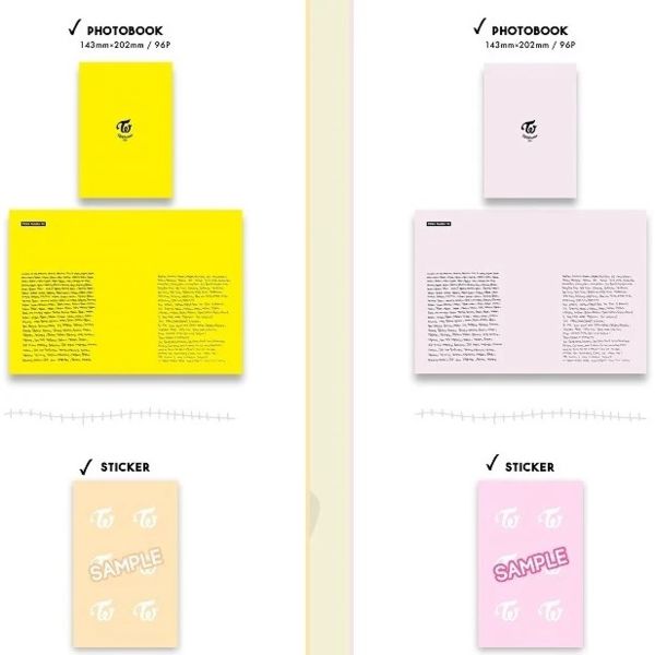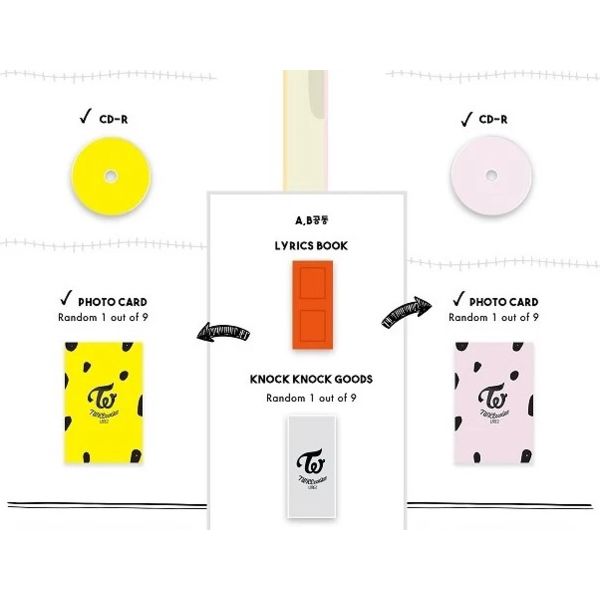 The physical package includes a 96-page photobook, CD-R, sticker, a random photocard (1 of 9), lyrics book, and themed “Knock Knock Goods” (1 of 9 random items). Some pre-order editions also included a poster and additional photocard set.