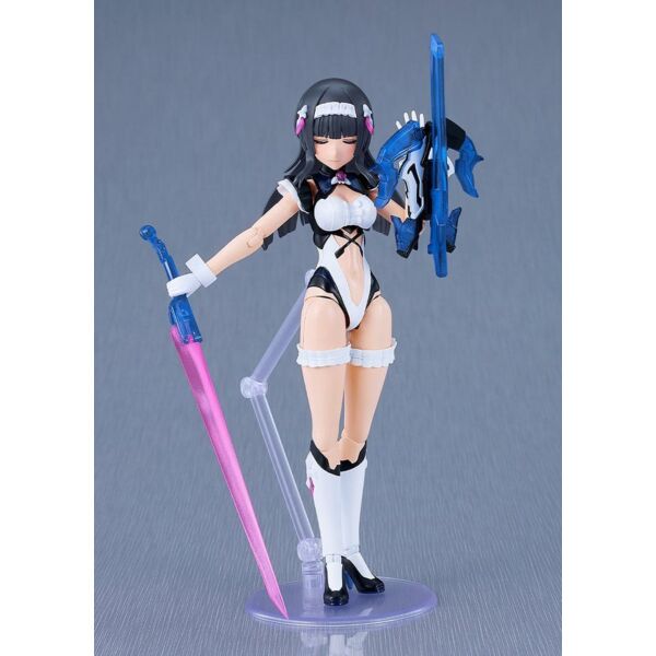 From the bishojo plastic model series "VALKYRIE TUNE" comes a PLAMATEA plastic model of the serious and stoic Erika = Stradivari! - The model stands at about 160mm in height and parts are separated into colored runners. The model features various points of articulation. - The various parts of model have been separated into different colored runners and pre-painted parts, making it easy to recreate the character with a simple assembly. - Four pre-painted face plates and four blank face plates with decals for customizing expressions are included. - Translucent parts are used in blue areas of the main body and weapons. - A violin type Harmonic Weapon is included, and can be transformed from Instrument Mode to Bowgun mode. - Armaments can also be reassembled to transform into a large blade. - Frills on the skirt and arms can be removed, and the model can be displayed in high-speed light equipment mode by rearranging certain parts. - Includes interchangeable hand parts and articulated stand.