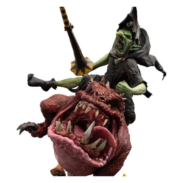 Piercing through the chaotic battlefield of the Gloomspite hordes come the Boingrot Bounderz, howling with glee atop their snarling squigs. Having earned 'veteran' status by virtue of surviving one or even two battles, these mad knights hurl themselves right back into battle with reckless delusion, trusting in their murderous mounts and wickedly pointed pokin' lances. Captured mid-charge at the peak of its anarchic momentum, this 1:10 scale Boingrot Bounder statue translates one of the Mortal Realms' most unhinged cavalry charges into finely resolved sculptural form. Squig and rider are locked in a moment of violent harmony: gaping jaws, tensed muscle, battered lance and moon-crazed madness all working together to convey a pair of creatures barely contained by the base beneath them. Great care has been taken to preserve the exaggerated character of the design while grounding it in believable weight and texture, ensuring the piece reads as both fantastical and physically present. This statue also marks our first exploration of the 1:10 scale, opening the door to a more compact format that retains the detailed polish associated with our larger works. Designed to integrate seamlessly into existing displays or stand proudly on its own, this scale offers new flexibility without compromise. Whether you are drawn to the chaotic spirit of the Gloomspite Gitz or seeking a striking entry point into a new scale, this Boingrot Bounder statue is a bold statement piece. - 1:10 scale; - Made primarily from polystone; - Digitally sculpted by Weta Workshop artisan, Jorgelina Yeme; - Dynamic pose captures both monstrous steed and crazed rider mid-charge; - Armed with iconic loon helm and pokin' lance; - Base complete with Gloomspite fungus. Size: 10,5 x 17 x 13,5 cm