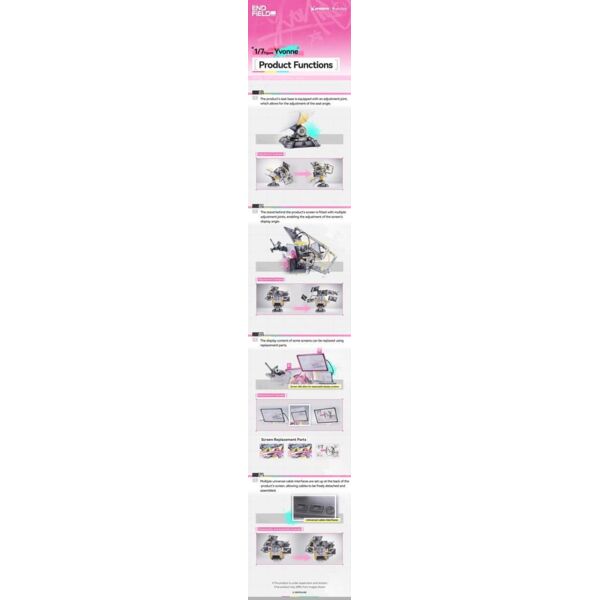 Estatua del videojuego "Arknights". Fabricada en PVC, a escala 1/7, mide 29 cm. Viene con una base en una caja con ventana. Contenido del set: - Figura principal - Base Bonus: - 3 x Contenido de pantalla reemplazable
