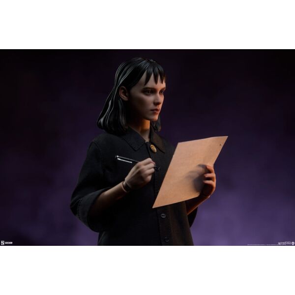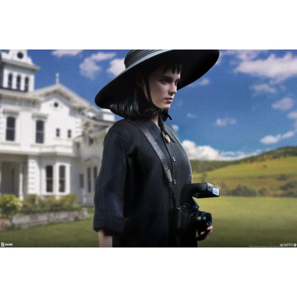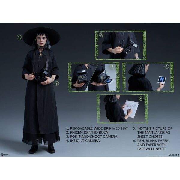 Sideshow presenta la figura a escala 1/6 de Lydia Deetz del clásico de comedia de terror de 1988, Beetlejuice. Esta figura articulada cuenta con un cuerpo articulado Phicen y un traje de tela cuidadosamente confeccionado. El conjunto completamente negro de Lydia viene con un sombrero de ala ancha extraíble. También se incluye una base de figura hexagonal negra. La figura a escala 1/6 de Lydia Deetz incluye: - Escultura de cabeza de Winona Ryder, como se ve en Beetlejuice - Traje a medida, que incluye: - Sombrero de ala ancha extraíble - Conjunto completamente negro - Botas - Seis (6) manos en total - Cámara de apuntar y disparar con correa - Cámara instantánea - Foto de los Maitland como fantasmas - Bolígrafo y papeles - Base hexagonal negra Tamaño del producto Altura: 25 cm
